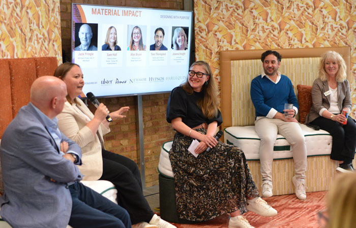 Last month, five of the UK’s leading commercial interior suppliers – Ulster Carpets, Panaz, Newmor Wallcoverings, Hypnos, and Harlequin, came together to host a timely and thought-provoking panel discussion at Ulster’s London showroom. With sustainability at the forefront of every design brief and global supply chains under scrutiny, the event placed materiality at centre stage to explore how British manufacturing is uniquely positioned to lead the next era of sustainable design.