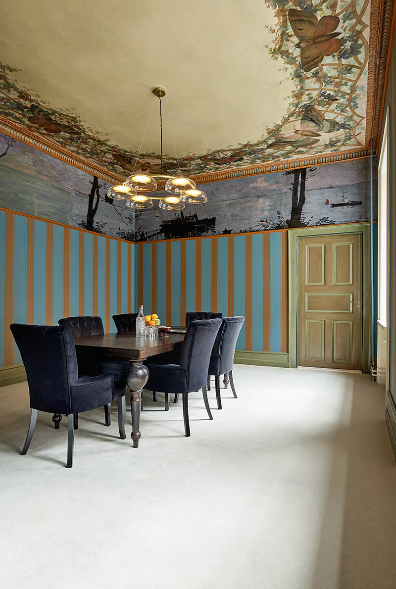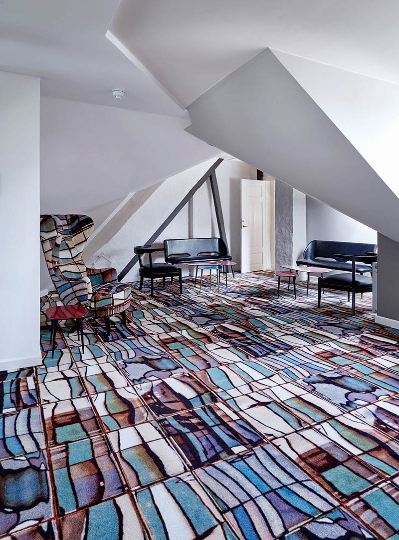 Moving up, the design look becomes younger. On the fourth floor, white walls make room for vibrant ege carpets from Industrial Landscape by Tom Dixon. The Blur and Smoke designs manifest the powerful expressions of the London inspired collection fabulating about this spectacular city that has, just like Brønnums Hus, really lived a few lives.