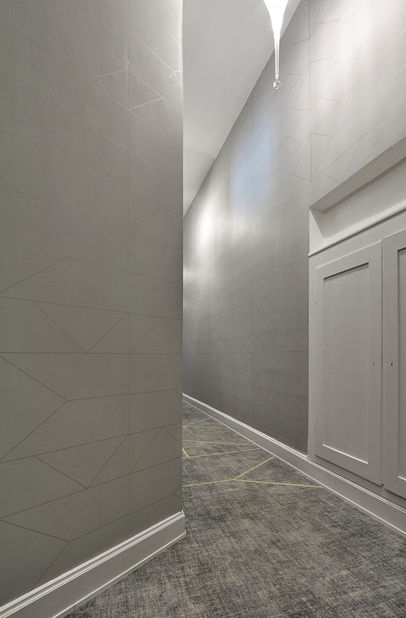 The corridors must be highlighted as well. Once again, the wallpaper forms the starting point of the carpet design being an abstraction over the wallpaper’s golden lines placed on a blue-grey background interpreted into a beautiful flooring design expressing an irregular worn canvas with trilateral golden lines.