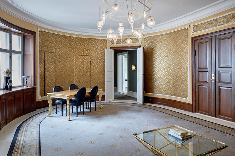 The carpet in the Golden Salon includes design elements from the wallpaper and radiator cabinets creating an imperial style design with a border and a center design with a beautiful diamond pattern. A very figurative design with a classic composition contrasting the rest of the house endeavoring modern design elements.