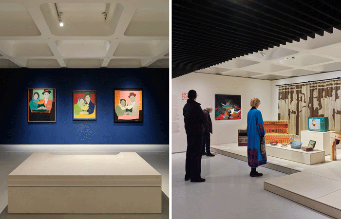 Unknown Works won an invited competition to work with the Barbican’s curatorial team on the design of the show. They created a spatial and material narrative based on ‘paper-tecture’, responding to the artist’s close working relationship with print media and its materiality. González’s work drew inspiration from found images she collected throughout her life, ranging from tattered reproductions of paintings from Western art history to newspaper clippings reporting on violent conflict and loss. She reworked and transformed these sources in a distinctive graphic style, using a bold colour palette, which also informed the choice of wall colours in the show.