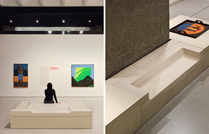 A panel product made of 100% paper called Honext – both recycled and recyclable – was experimented with in a number of different ways throughout the exhibition. First, in sheet form, with individual panels abutted next to each other to form an undulating display landscape. Then, the product was layered to form solid blocks that were carved using a CNC (Computer Numerical Control) machining process to make four monolithic benches that allow visitors to reflect on the monumental scale and impact of González’s works.