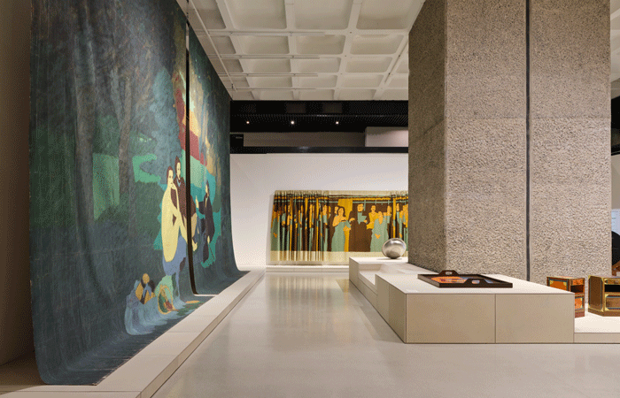 The exhibition starts formally at the upper level, where the more cellular gallery spaces play host to paintings, prints, textiles and smaller objects. González’s collection of newspaper cuttings and reference materials, housed in vitrines made of paper, line the upper mezzanine walkways so that visitors can view the collection in the context of the work it inspired.