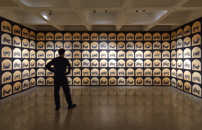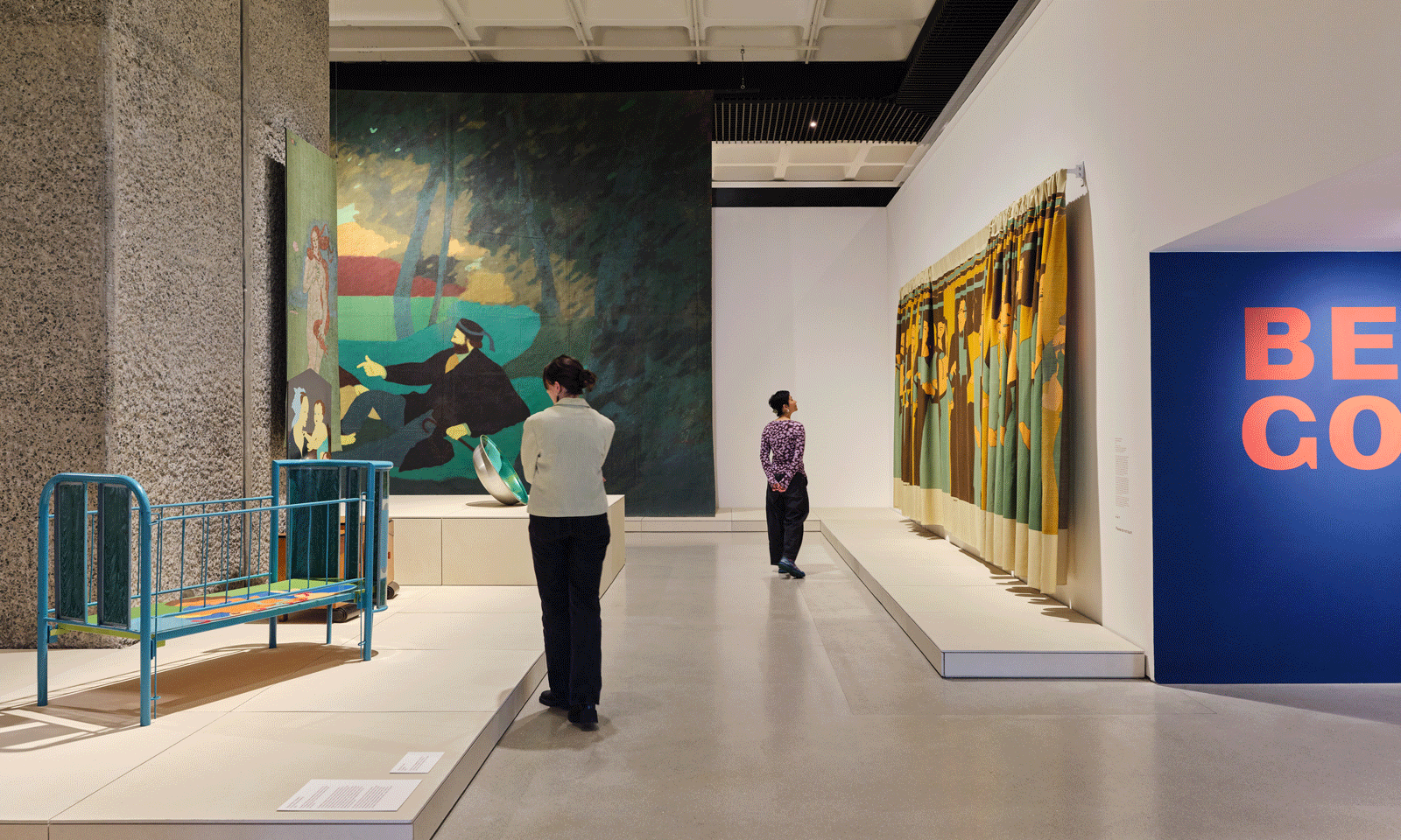 The show is located in the Barbican’s main, 2-storey, 1,500 sq m third floor gallery, made up of a central, double-height area and a galleried upper floor. Each level sees a different approach to exhibiting and framing work, from low level plinths to hold sculptures in open spaces to more conventional gallery spaces for hung works.
