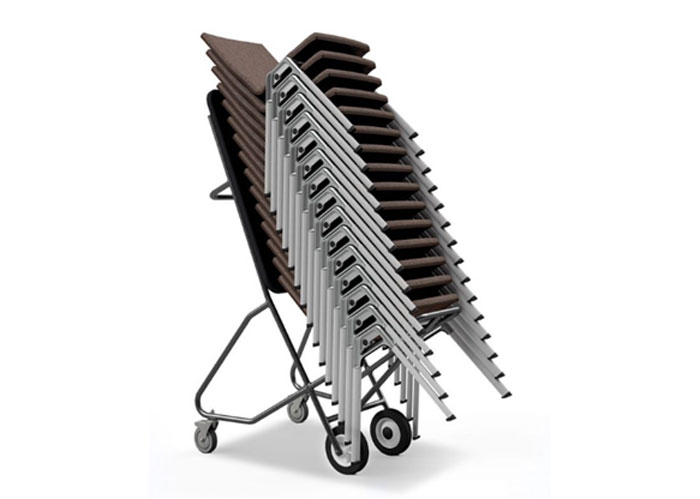 The Adatta answers the brief with the lightweight aluminium frame featuring an oval leg extrusion (solid powder coat finish) which sockets onto a bespoke polished casting. The casting can be powder coated to match the legs. The unique design ensures there are no visible stacking buttons on the legs while the chairs can be securely stacked 15 high for storage and will still fit through a standard height doorway on its own trolley.