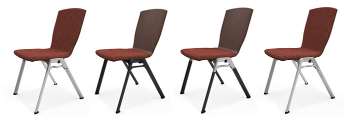 The concept should incorporate a choice of frame, upholstery & showwood options to suit a wide spectrum of interiors and a variety of bases including a compact 4-legged stacking frame, swivel bases and skidbases. During the early stages of the design it was felt that the brief should separate the stacking chair from the swivel bases requirement, so the Enrica range with swivel & skidbase models was developed in tandem with the Adatta range sharing the wooden shell & upholstery details.