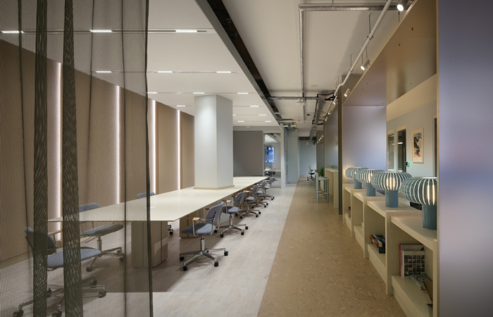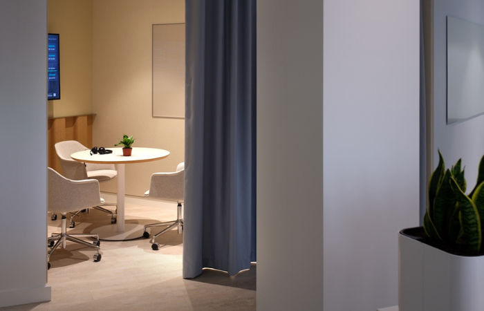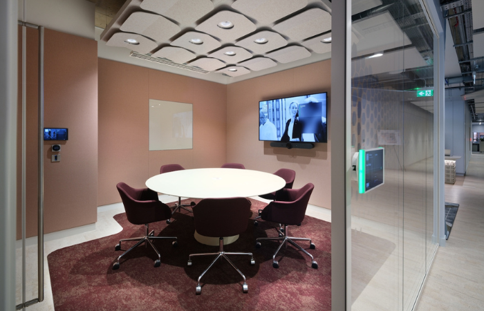 Natural textures such as renewable two-tone cork flooring enhance acoustic performance, while exposed concrete aggregate panels contribute to an authentic and construction-inspired aesthetic. Milliken carpet tiles were selected for their low-emission credentials and established take-back programme, ensuring future circularity.