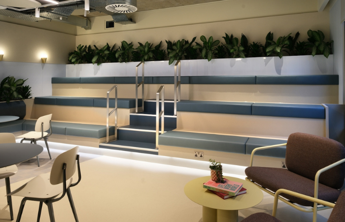 Open-plan desking integrates seamlessly with four flexible collaboration and touchdown areas, seven acoustic pods, two focus rooms and 15 varying meeting rooms, with three large, divisible meeting rooms being capable of hosting 50-person conference-style meetings, talks and presentations. Bleacher-style seating supports both internal and external town halls. These spaces encourage varied modes of working, with details such as writeable surfaces, pin-able panels and tables on castors also ensuring they can adapt over time.