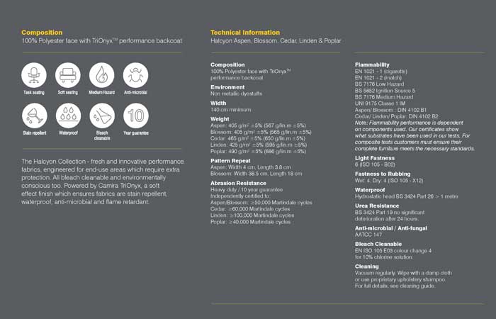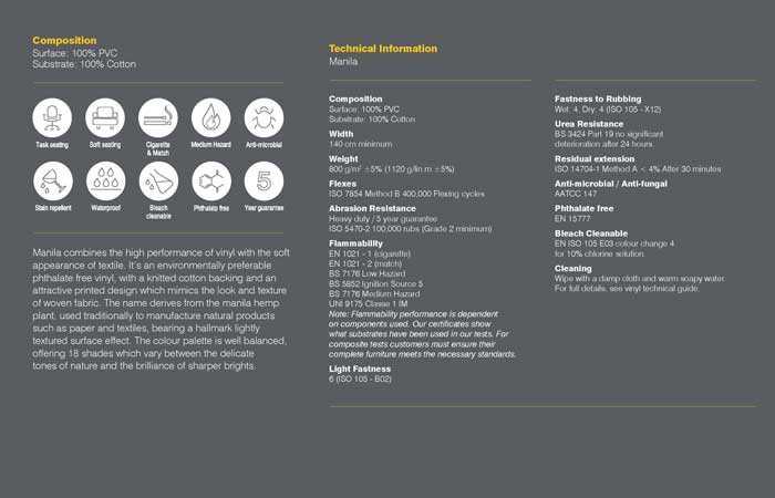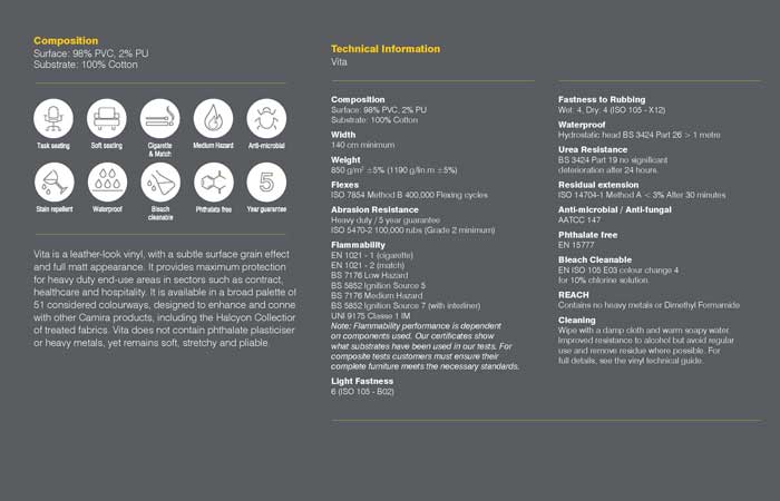 To make this easier for designers and manufacturers to navigate and digest, Camira have compiled their collection of performance vinyls, which are all anti-microbial, bleach cleanable, waterproof, and flame retardant to the higher level Crib 5 Medium Hazard Standard. Find these collections below or view the booklet in full here.