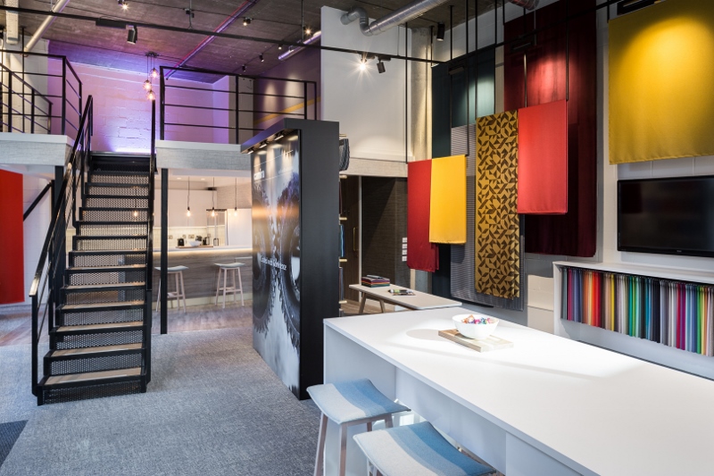 The new space is unapologetic in its use of dramatic large scale fabric displays to present the unique products the company manufactures and maximise visual impact through the floor to ceiling glass façade of the building. An open mezzanine overlooks the main showroom, the centrepiece of which is an ingeniously engineered collaboration counter using a reclaimed warp beam from Camira’s Huddersfield textile manufacturing operation.