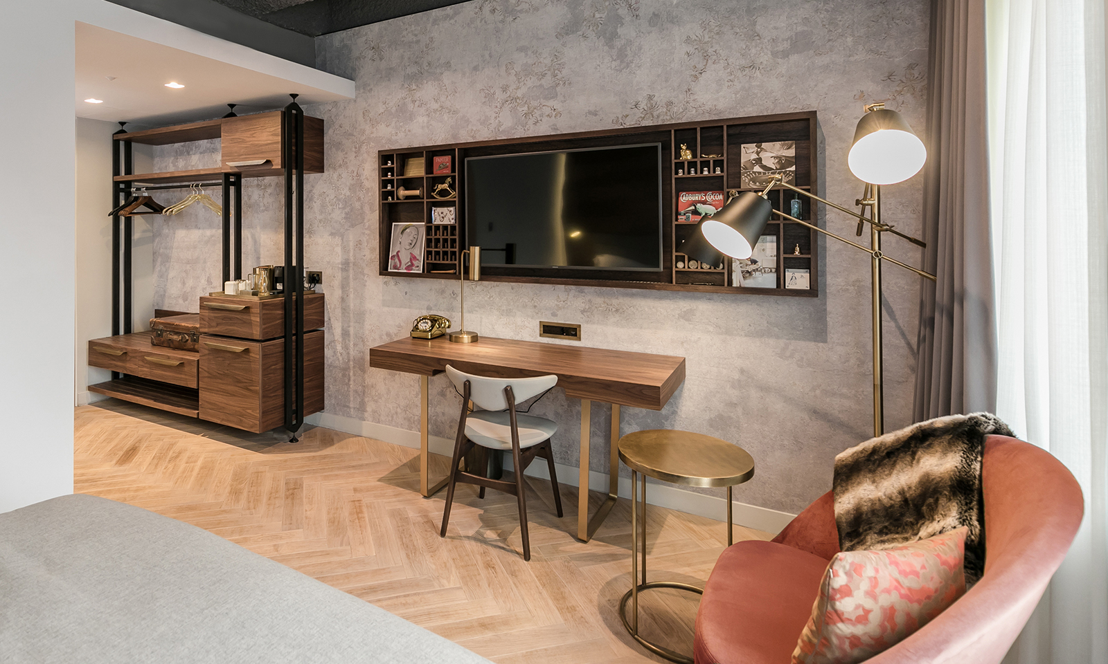 The interior design of the hotel rooms seeks to stay true to the modernist building, with a wardrobe designed in the spirit of Jean Prouvé, featuring lightweight steel and timber structures temporarily inserted between floors and ceilings. Carpets and wall fabrics are inspired by the woven legacy of the Huguenots, using an abstracted floral pattern of Anna Maria Garthwaite (1728-1763).