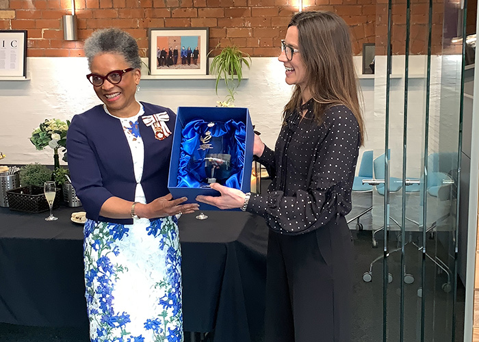 Sam Rowe, CEO Ignition & Istoria Group receiving The Queen’s Award for Enterprise in Sustainable Development from Mrs Peaches Golding OBE CStJ, Her Majesty’s Lord-Lieutenant for Bristol