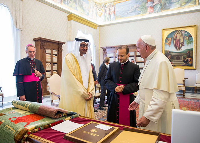 Sheikh Mohamed bin Zayed, Crown Prince of Abu Dhabi and Deputy Supreme Commander of the Armed Forces, gave the FBMI “Pontifex Carpet” to the pope during a visit to the Vatican
