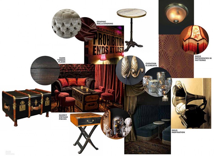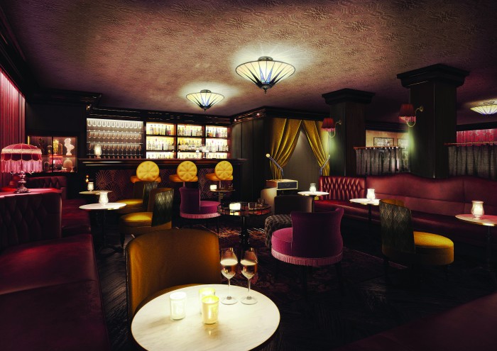 In contrast to both the Mercer Bar & Vintry Kitchen, the opulent basement speakeasy bar, Do Not Disturb, revels in its freedom from architectural intervention, and makes a feature of the lack of windows and roof lights. Instead we opted to accentuate the darkness. The DND bar is heavily influenced by the Art Deco period; ceilings are lined with decorative mouldings and trims are painted dark claret to tie in with the curved Deco-inspired lounge banquettes. Vintage lights and curiosities are wrapped in low-level lighting to set the mood.