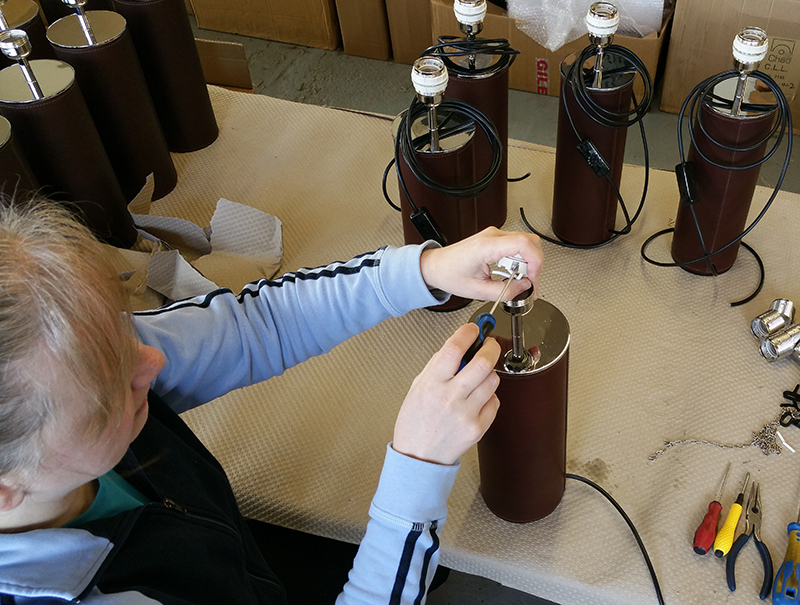 A member of Chad’s production team wires up their Siena table light. All units are then put through the Clare electrical tester to ensure that they are safe for customer use and meet all the British standards.