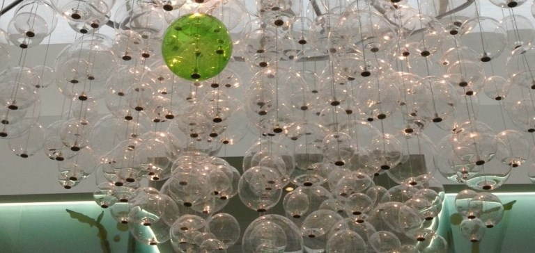 The spectacular centrepiece chandelier is undoubtedly the focal point of The Orangerie, featuring a cascading sculpture of more than 200 clear glass balls offset with a single sphere of lime green mouth- blown glass designed to coordinate with the wider interior scheme. Randomly suspended on fine steel strainer wires around a 2m cartwheel frame, the hand-made ellipse glass balls are of varying sizes and have been designed to create an illusion of floating bubbles. The fitting creates striking impact in the heart of The Orangerie yet also offers ease of maintenance through the chrome ceiling plate which allows easy access to the transformers. Illuminated by 35 watt Britespot lamps built in to the metal framework, the fitting serves to complement the natural light of The Orangerie and has been designed to be as energy efficient as possible to provide a long life solution to reduce maintenance.