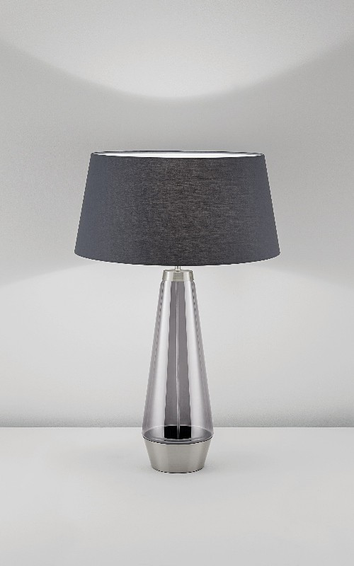 Pictured above in Brushed Nickel with iridescent Smoke glass, the range is also available in English Brass with Clear glass and is offered with an alternative cylindrical base.