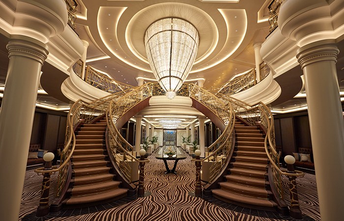 The interior designers who create the spectacular interiors of today’s ships are real specialists in their field. They have an overall brief to be extravagant, breath taking, original and awe inspiring and in the case of public areas they can work on a massive scale within the huge spaces which can sometimes transcend three or four decks.
