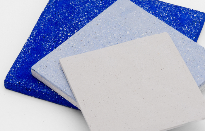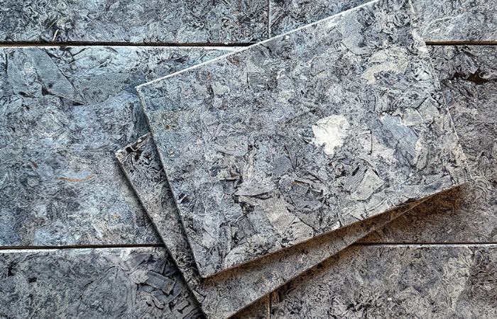 Reconstituting waste to form solid surfaces doesn’t necessarily require hard materials to do so, as proven by Josh Myers and Smile Materials during the show. The latter used the event an opportunity to launch the Fibres range, which metamorphoses textile waste, including post-consumer denim, into rigid boards.