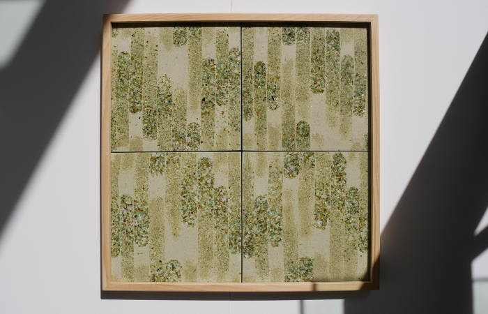 While glass is generally considered an infinitely recyclable substance, there are still occurrences when it reaches its maximum, and notably, there was very little glass on display across the event. Designer Wilfred Becret is valorising glass dust, the recycling residue from glass products that ordinarily gets buried as it is deemed unusable. For Becret it represents an opportunity, and in combining ceramic and glass making know-how, he has created a durable architectural cladding that is rich in texture and varying in shades.