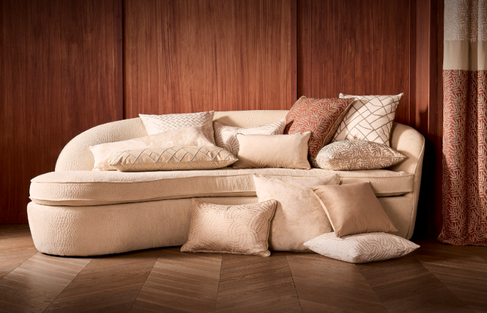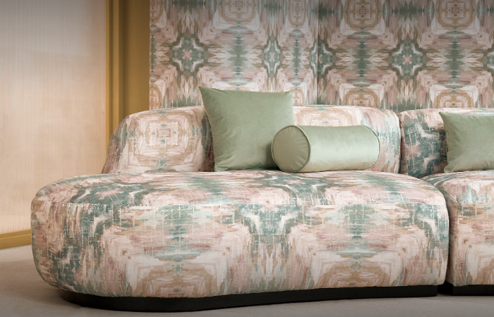 Wallpapers mirror these motifs, enveloping interiors in flowing natural landscapes or bold, abstract murals. Across fabrics and walls, the palette blends soft neutrals, inky, sepia tones, and deep greens, creating interiors that feel layered, textured, and alive with movement.
