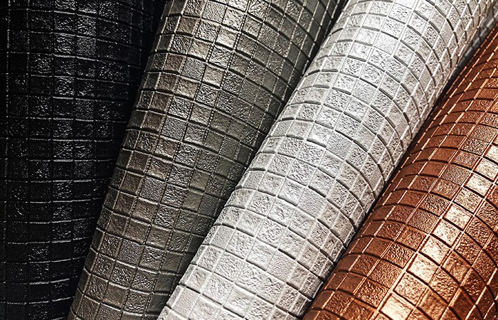 Tessello is a masculine geometric texture features small cubes on 3 levels, which gently catch the light for a dappled, pixelated effect. The deeply embossed cubes have a rough concrete texture which give the design an industrial edge. Available in 20 confident but useable colourways with key accents of mustard, metallics, oxblood, olive and the stunning chameleon iridescent colourway which flips between emerald and ultraviolet.
