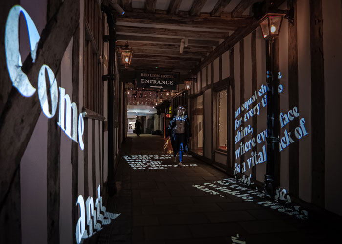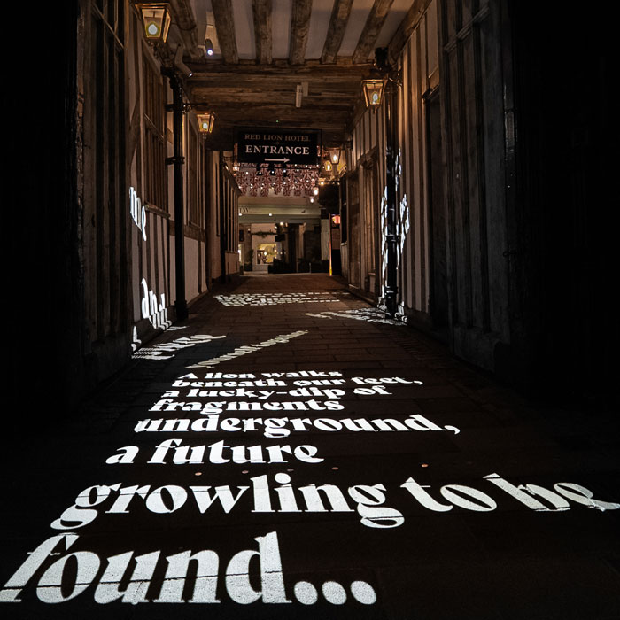 Roman ruins were recently uncovered beneath the Lion Walk site, amongst them a mosaic depicting a lion. This previously hidden feature, along with comments gathered from the local community, influenced a co-created poem by Beth Calverley whom f.r.a. commissioned having worked together previously on another project. f.r.a. then typeset passages of the poem and designed a series of projectors to display excerpts on the ground of the walkway through the Red Lion’s listed building.