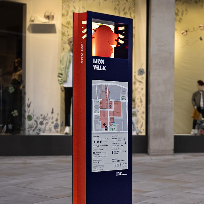 Lion Walk, situated in the heart of Colchester off the City’s main high street, has been a shopping destination for over 50 years with a mix of independent, local, and high street brands. Following a brand refresh, f.r.a. were appointed by Lambert Smith Hampton as wayfinding designers to help encourage and guide visitors into the centre.