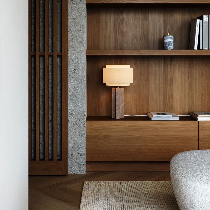 The Takai table lamp structures from a solid, brown geometric marble base that effortlessly carries the light fabric shade, making it a beautiful statement piece. Marble is a unique natural material and therefore lines, colours and patterns may vary from lamp to lamp. This is a part of the charm of working with natural materials.