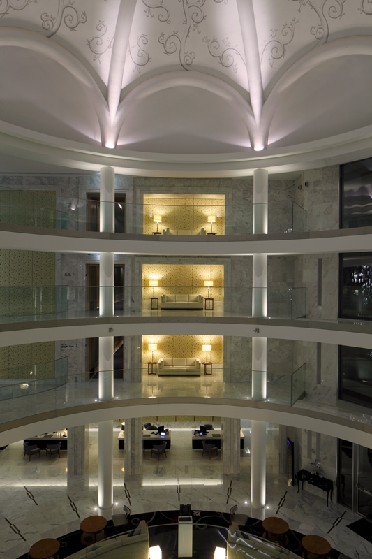 On looking up at the grand dome, which John Seifert made the centre piece of the hotel, guests see a trompe l’oeil floral relief, with full-height glazing to the rear and front; a focal point in the six-storey atrium void. Marble flooring further enhances the features.