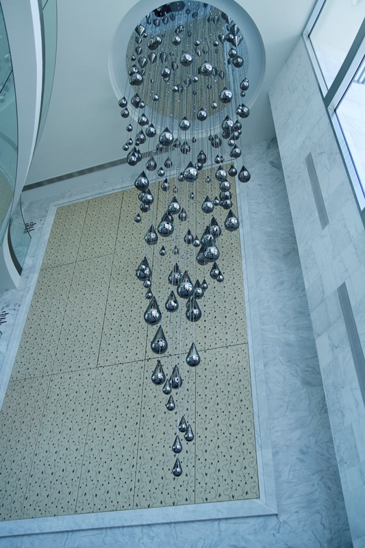 The chandeliers from Beau McClellan Design – at a 10.5m-drop – draw eyes looking up and down. They dramatically form the ceiling to the first floor, mirrored and reflecting the surroundings – full-height marble wall panelling for both visual and aural interest.