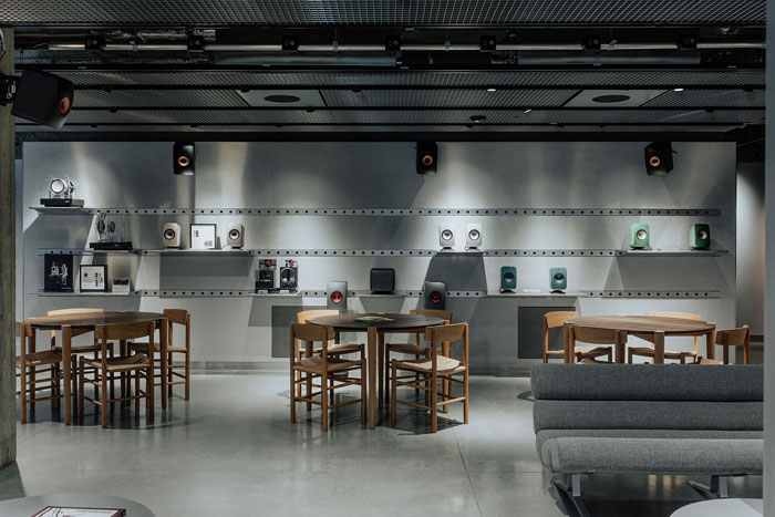 The Gallery on the ground floor is conceived as an urban oasis, featuring concrete floors, rendered walls and an engineered aluminium grid ceiling. This space aims to welcome newcomers to the world of audio technology in a relaxed and inviting atmosphere, a café by day and dynamic event space by night, as well as an intimate studio space, both designed to encourage exploration and engagement with KEF’s products with an imaginative programme of activations. Pockets of living room-like spaces are strategically placed throughout the area, defined by flexible bespoke shelving units filled with curated selections that invite exploration.