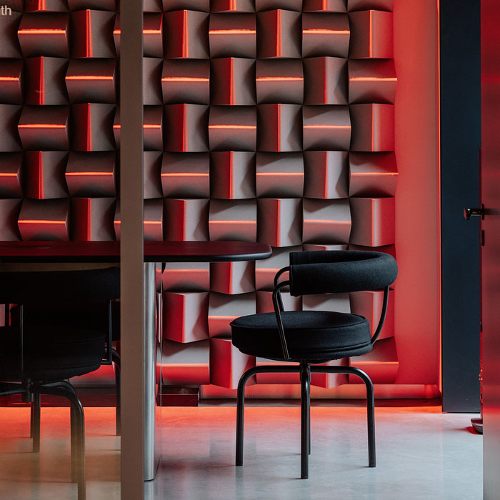 Adjacent to the main space and facing the street is The Studio, a unique space dedicated to the exploration of audio media. Designed for musicians, artists, and collaborators to create and enjoy outstanding soundscapes, this space is equipped with state-of-the-art acoustics specially engineered to minimise background noise, inviting passersby to engage with KEF’s multimedia offerings. The textured foam wall panelling is based on anechoic chambers as used in KEF’s engineering HQ in Maidstone.