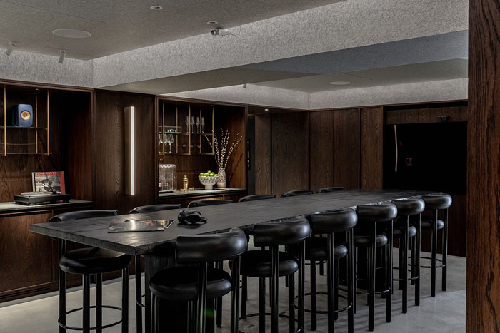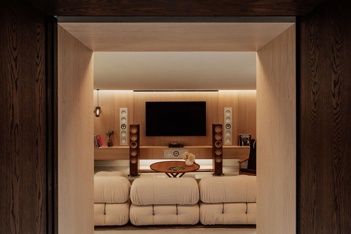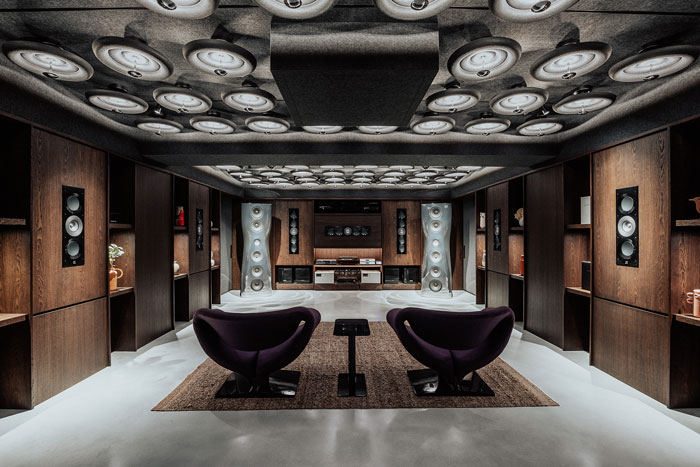 Descending into the lower ground floor, visitors are transported into a space tailored for audiophiles and connoisseurs seeking a deeper immersion into the world of audio technology. Here, Conran and Partners shifted the design towards a more intimate residential feel, with warm oak timber panelling and a series of intimate environments, each offering a unique perspective on KEF’s products. Refined timber wall panelling adorns the walls, adding warmth and sophistication to the space. Soft furnishings, carefully selected for their comfort and style, invite visitors to linger and explore.