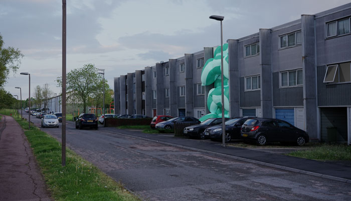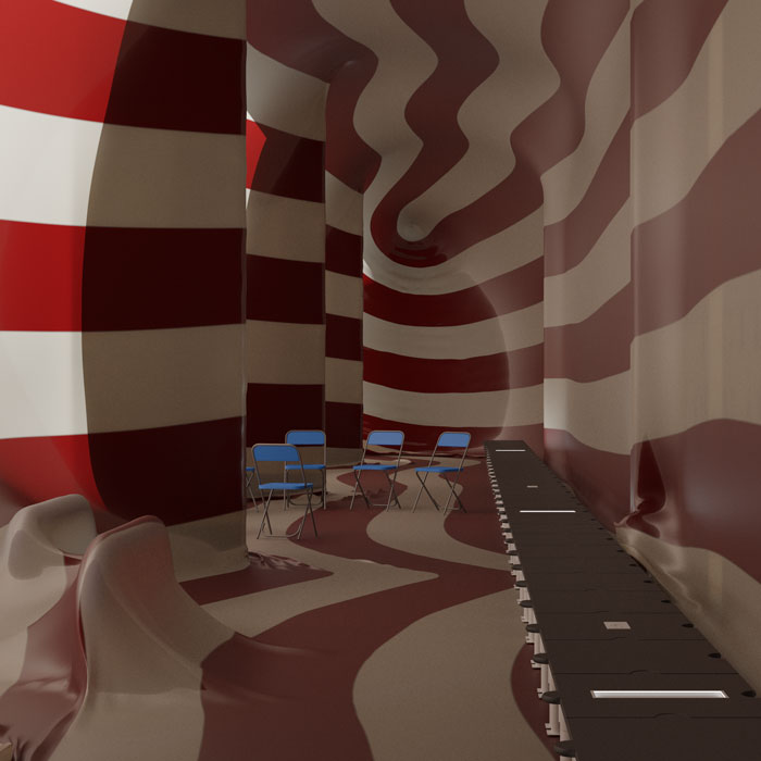 What comes from this thinking are temporary structures that can be deployed at speed, taking up residence in spaces that might be forgotten or overlooked. The striped inflatable fabrics are introduced to buildings, growing and spreading to encapsulate the details within, creating abstract environments that blur the lines between what is real and fake as well as what we deem private and public.