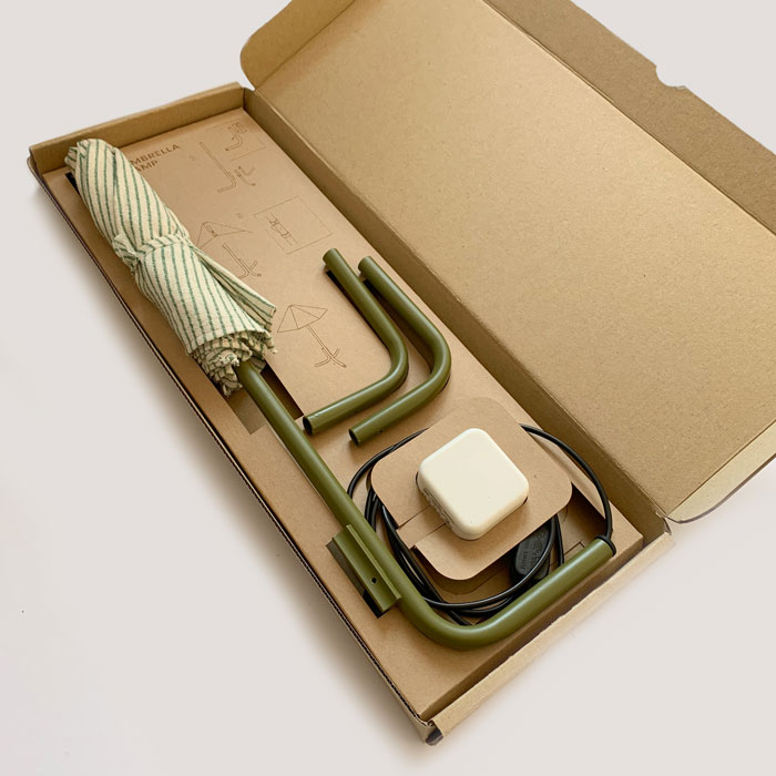 Lighting is a prime example of a product that ordinarily requires large boxes, impact resistant padding and with it a face-to-face delivery, but the Umbrella Lamp cleverly bypasses all of these. Made from painted metal tubing and fabric the self assembly pop-up desk lamp is inspired by it’s namesake and fits inside a standard sized, Royal Mail approved box. Other variations include versions inspired by fans and springs, which offer a range of design styles while all offering the guarantee of stress-free delivery.