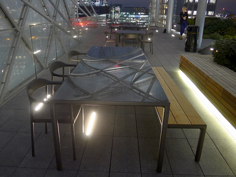 The R+W Larch and steel collection was specified by AHMM and fulfilled by Contrakt Ltd. The brief was to deliver and install these heavyweight tables and benches to the roof without disturbing office tenants.