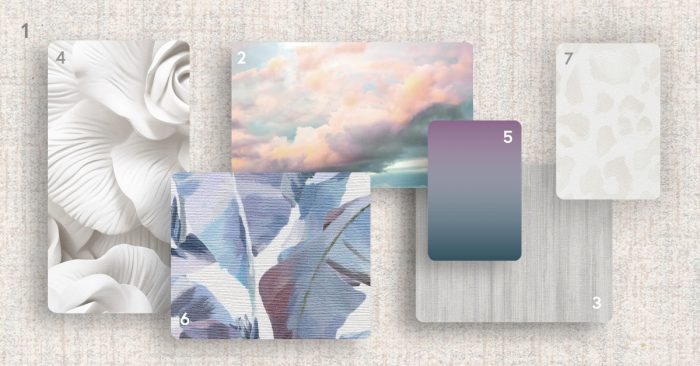 1. Java JAV003, 2. Sanctuary Nimbus, 3. Slate SLA001, 4. Industrialis Rosa, 5. Blooming Marvellous Ombre Ultra Violet, 6. Folia FOL005, and Panthera PAN001.