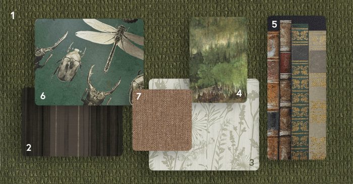 1.Prism PSM008, 2. Eri Stripe EST005, 3. Meadow MEA004, 4. Cedar CED005, 5. Athenaeum Biblioteca, 6. Athenaeum Entomology, and 7. Oxford OXF009.