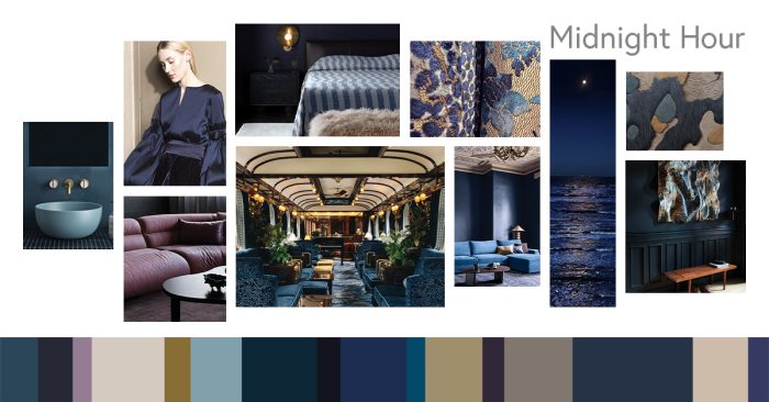 “Midnight Hour is about intrigue and elegance. These are interiors designed to be immersive and enveloping, where darker tones create a sense of drama and comfort. Colours such as mauve, navy, teal, ink and old gold are softened with taupe and burnished metallic accents to create depth and balance.”