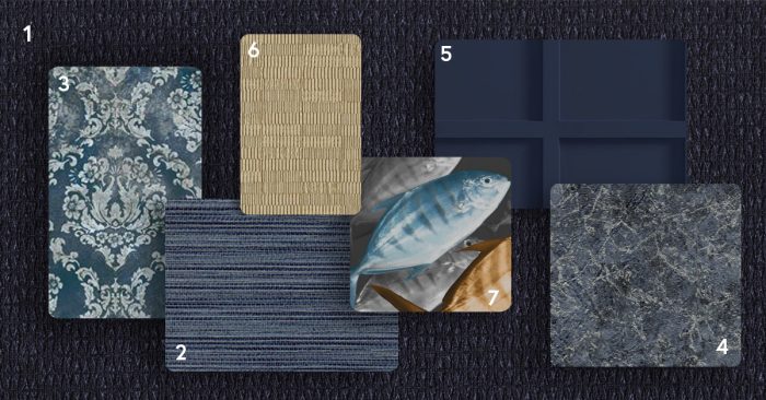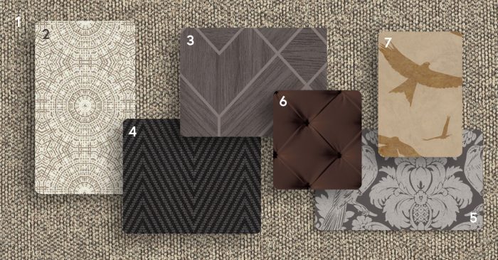 1. Prism PSM001, 2. Tatami TAT005, 3. Raw Surfaces Distressed Damask, 4. Carrara CAR006, 5. Trompe L’oeil Lambris Peacock, 6. Piazza PIA009, and Athenaeum Maris.