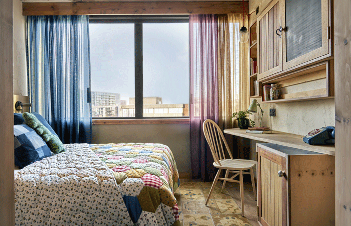 Key to the desired look and feel for the space was to use distressed wood, featuring bumps, knocks and knots, for the cased goods including headboards, bedside tables, wardrobes, desks, vanity units and shelving.
