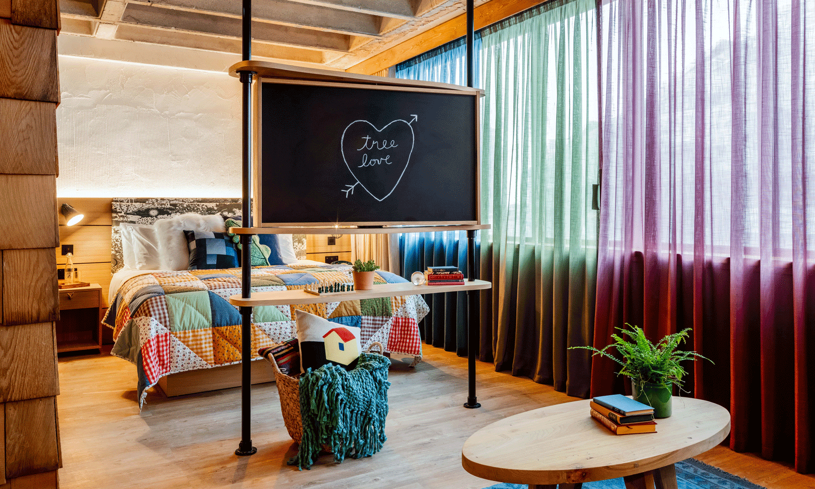 Among the most intricate custom elements was a rotating TV box. Set within a shelving frame made of scaffolding poles and distressed wood, it allows guests to swivel the screen between the bedroom and lounge areas. The mechanism needed to rotate smoothly while stopping short of a full 360° turn to protect hidden electrical cabling. With nothing suitable readily available on the market, Curtis Furniture engineered a bespoke solution to the challenge.
