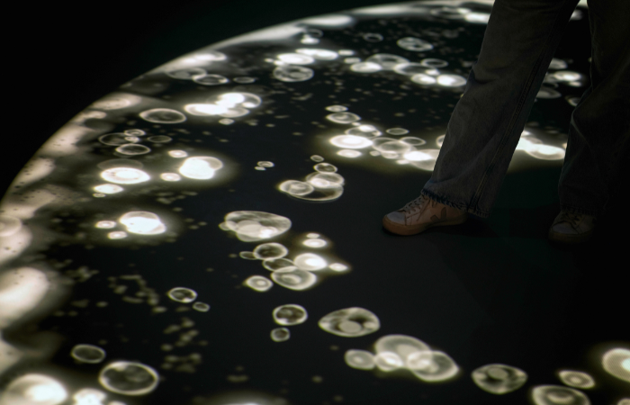 Four projectors work in tandem to create a large circular focal point, representing a petri dish, inviting those keen to engage to walk amongst the cells. Sensors tracking the movement in the room and allow the visitor to move the cells around as they walk. Circular mirrors in the ceiling create a feeling of being amongst the yeast and provide a fun selfie opportunity for visitors who look up.