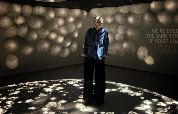 “As an important stage in the overall Ingredients Journey, we wanted to create a living, breathing real-time system of yeast in liquid nitrogen; something as delicate as it is dynamic. Working with specialised Notch artists and TouchDesigner, we created a four‑projector mapping system with a custom‑built tracking setup to flood both the space and the audience with texture and tactility. This created an interaction that is playful and responsive, yet gentle enough for visitors to appreciate the intricate details of each budding cell through a creative lens. Our aim was to give people the uncanny sensation of moving through a liquid nitrogen storage container, to make the science not just visible, but immersive and tangible.”
