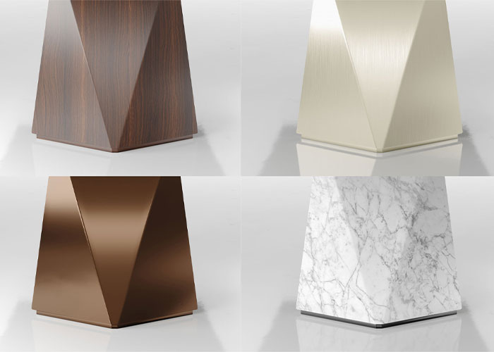 Recessed base panels permit a mix of materials and finishes, including wood, metal, powder coat, solid surface, and lacquer.