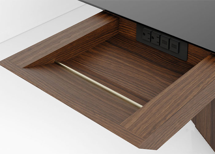 Fitted with concealed drawers that preserve the table’s purity of line while providing discreet wire management and access to power.