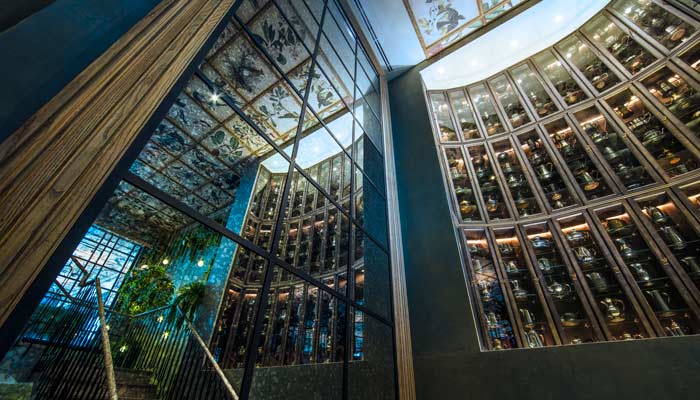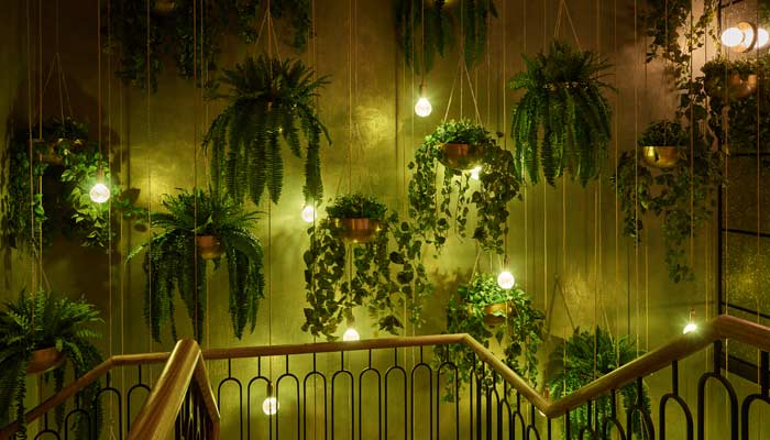 The grand staircase leading diners upstairs is enriched by an arresting double height panel mirror and glass display cabinet showcasing a beautiful vintage collection of tea and coffee pots. The top of the stairs is dressed with an exquisite hanging garden wall high lit by low-hanging lights.
