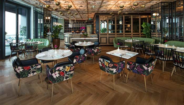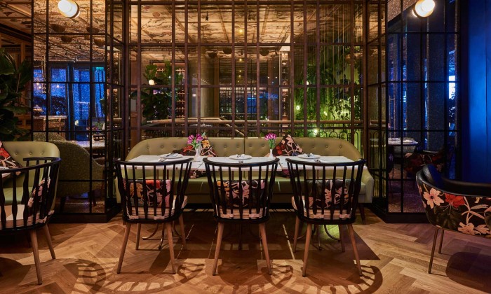 The downstairs café provides a sophisticated and relaxed environment with a unique blend of casual seating including luxurious leather banquettes, upholstered dining chairs and intimate bar stools which are set against an impressive open kitchen counter offering guests the chance to experience an avid sense of culinary theatre. A fresh palette of dusty pinks and hues of mint green conjure an air of understated elegance with aged mirror screens and herringbone oak flooring bringing in a more traditional feel.