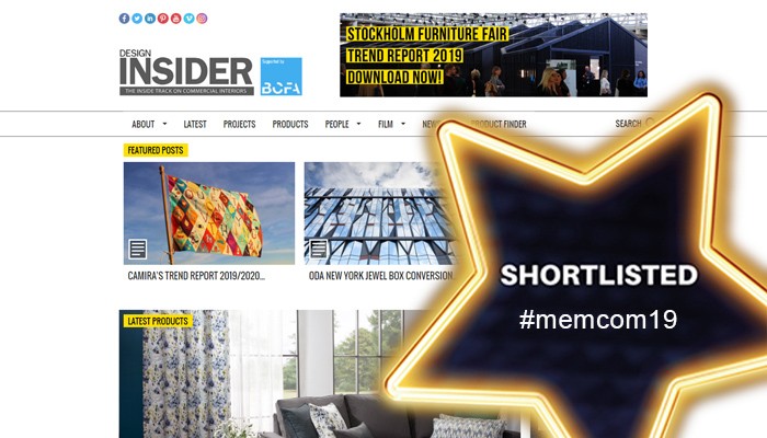 Design Insider have worked strategically over the last 5 years to create engaging content for interior designers, specifiers and end users resulting in over 6,000 newsletter subscribers and in excess of 10,000 social media followers. This achievement is testament to the Design Insider team’s hard work and with memcom celebrating its 20th year, 2019 seemed an exciting time to enter!